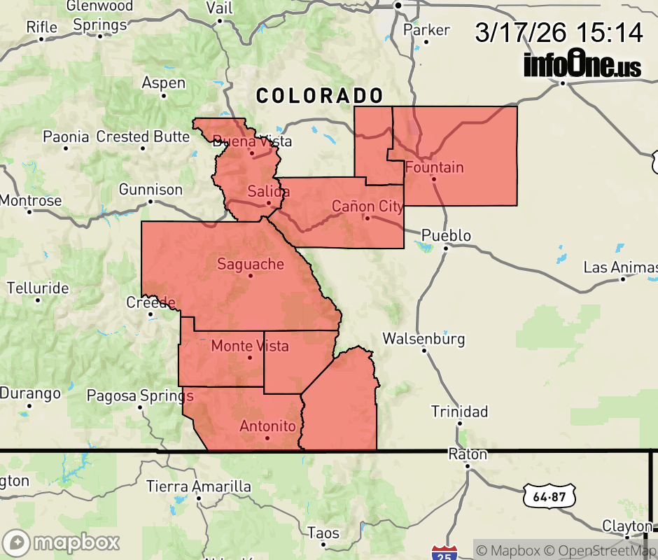Canceled 3/18/26 2:40 AM Red Flag Warning issued March 17 at 1:13PM MDT until March 18 at 9:00PM MDT by NWS Pueblo CO The National Weather Service in Pueblo has issued a Red Flag Warning for gusty winds and low relative humidity, which is in effect from noon to 9 PM MDT Wednesday. The Fire Weather Watch is no longer in effect. * AFFECTED AREA... Fire Weather Zones 222 and 224. * WINDS... Northwest 5 to 15 mph with gusts up to 30 mph. * RELATIVE HUMIDITY... As low as 8 percent. * IMPACTS... Fires will catch and spread quickly. Exercise extreme caution with any outdoor burning. ![]() |