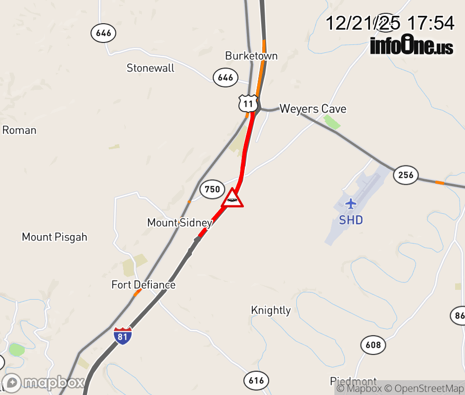 On I-81 at mile marker 233.5 in the County of Augusta, motorists can expect delays due to a multi-vehicle crash. The south right shoulder is closed. Traffic backups are approximately 2.0 miles. Updated: Sun 12/21/25 5:54 PM EST ![]() Updated: Sun 12/21/25 5:54 PM EST |