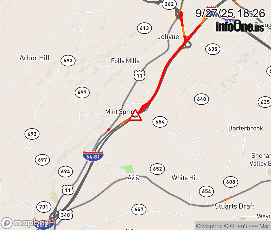 On I-81 South at mile marker 217.6 in the County of Augusta, motorists can expect delays due to a tractor trailer crash. Traffic backups are approximately 3.0 miles. Updated: Sat 9/27/25 6:26 PM EDT ![]() Updated: Sat 9/27/25 6:26 PM EDT |