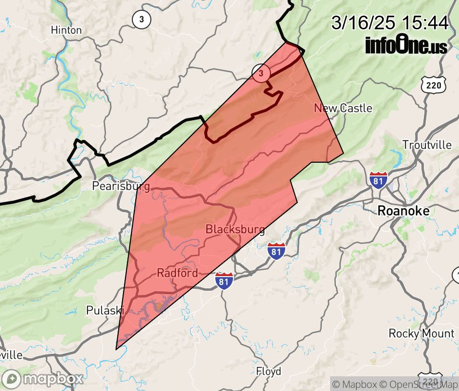 Canceled 3/16/25 4:15 PM Special Weather Statement issued March 16 at 3:43PM EDT by NWS Blacksburg VA At 343 PM EDT, Doppler radar was tracking strong thunderstorms along a line extending from near Mountain Lake to Claytor Lake State Park. Movement was northeast at 70 mph. HAZARD...Wind gusts up to 40 mph and pea size hail. SOURCE...Radar indicated. IMPACT...Gusty winds could knock down tree limbs and blow around unsecured objects. Minor hail damage to vegetation is possible. Locations impacted include... Blacksburg... Christiansburg... Radford... Pulaski... Dublin... Pembroke... and Newport. ![]() |