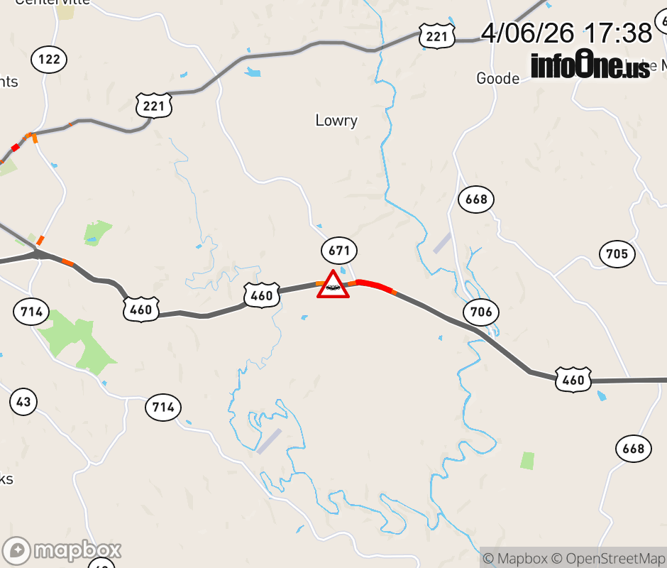 On US-460 West in the County of Bedford, in the vicinity of Merriman Rd; Rt. 715N/S (Bedford County), motorists can expect delays due to a vehicle crash. Lane closures exist. ![]() |