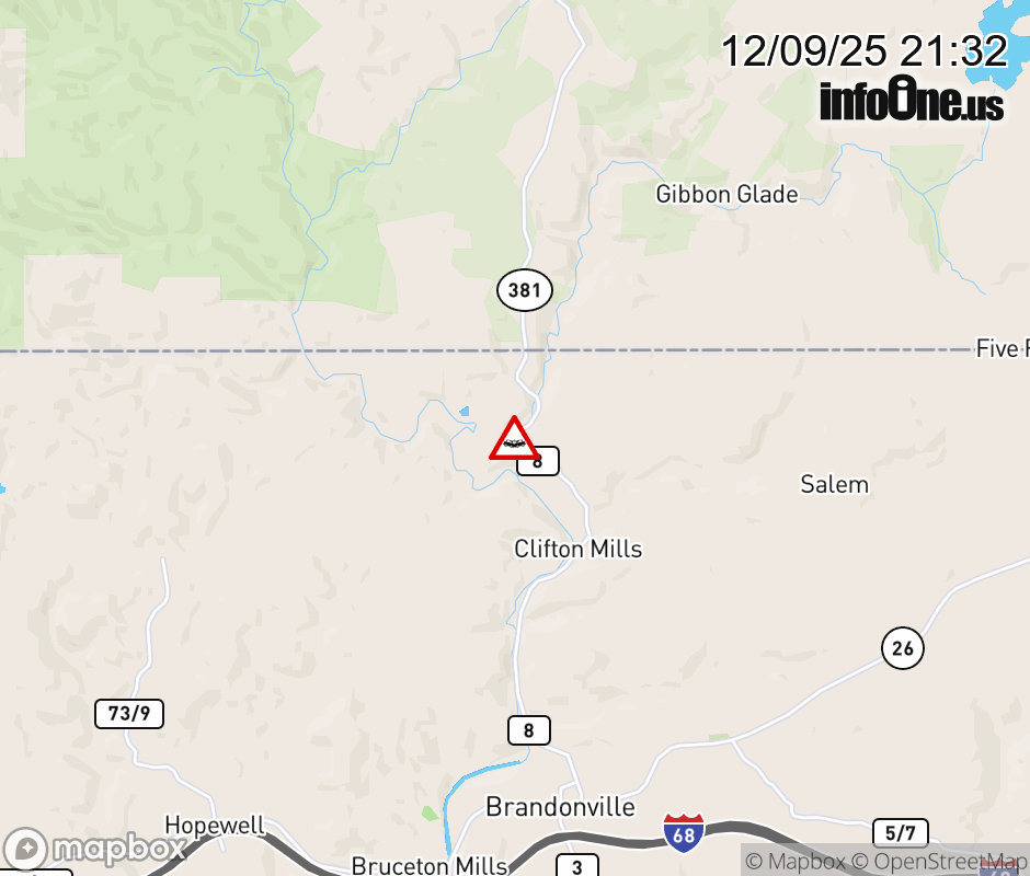 Vehicle Crash on CR-8 (3879 Clifton Mills Rd, Bruceton Mills). The northbound road is closed. The southbound road is closed. Updated: Tue 12/9/25 9:32 PM EST ![]() Updated: Tue 12/9/25 9:32 PM EST |