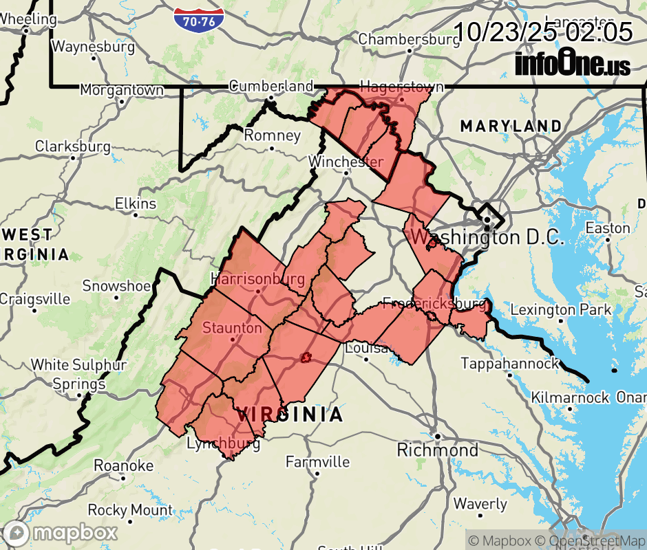 Canceled 10/23/25 8:10 AM Frost Advisory issued October 23 at 2:04AM EDT until October 24 at 9:00AM EDT by NWS Baltimore MD/Washington DC * WHAT... Temperatures as low as 33 will result in frost formation. * WHERE... Portions of north central Maryland, central, northern, and northwest Virginia, and panhandle West Virginia. * WHEN... From 2 AM to 9 AM EDT Friday. * IMPACTS... Frost could harm sensitive outdoor vegetation. Sensitive outdoor plants may be killed if left uncovered. ![]() |