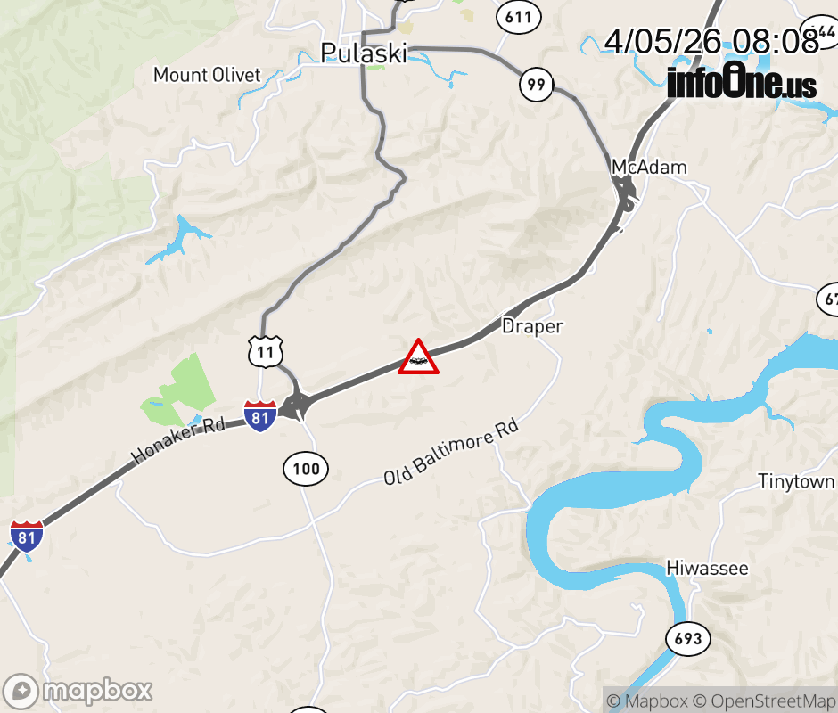 On I-81 at mile marker 91.4 in the County of Pulaski, motorists can expect delays due to a vehicle crash. The south right shoulder is closed. ![]() |