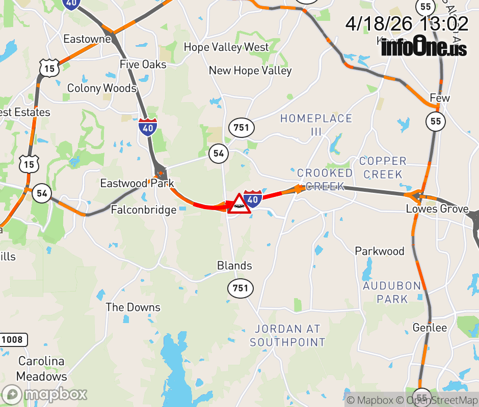 The shoulders are closed near Exit 276 (NC 751). Updated: Sat 4/18/26 1:02 PM EDT ![]() Updated: Sat 4/18/26 1:02 PM EDT |