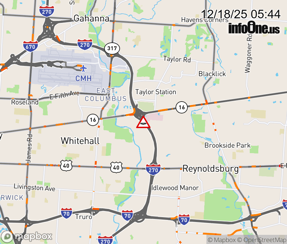 The right shoulder is blocked on I-270 South beyond SR-16 East/Broad St, due to a crash. ![]() |