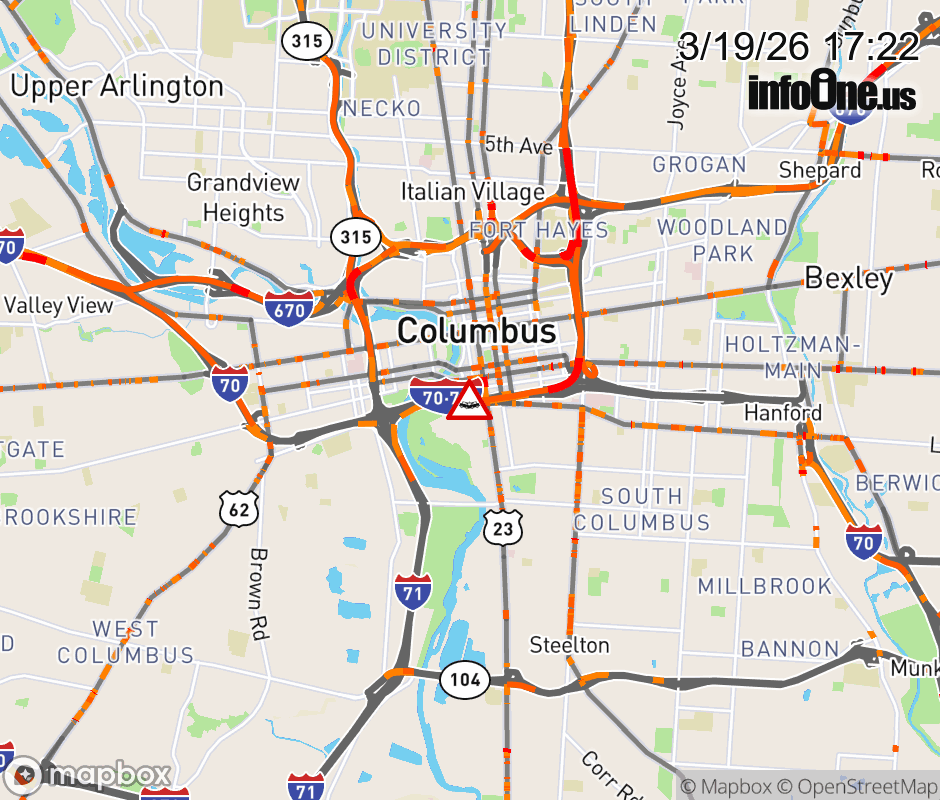 The left lane is blocked on I-70 East/I-71 North at US-23 South/Front St/High St, due to a crash. ![]() |