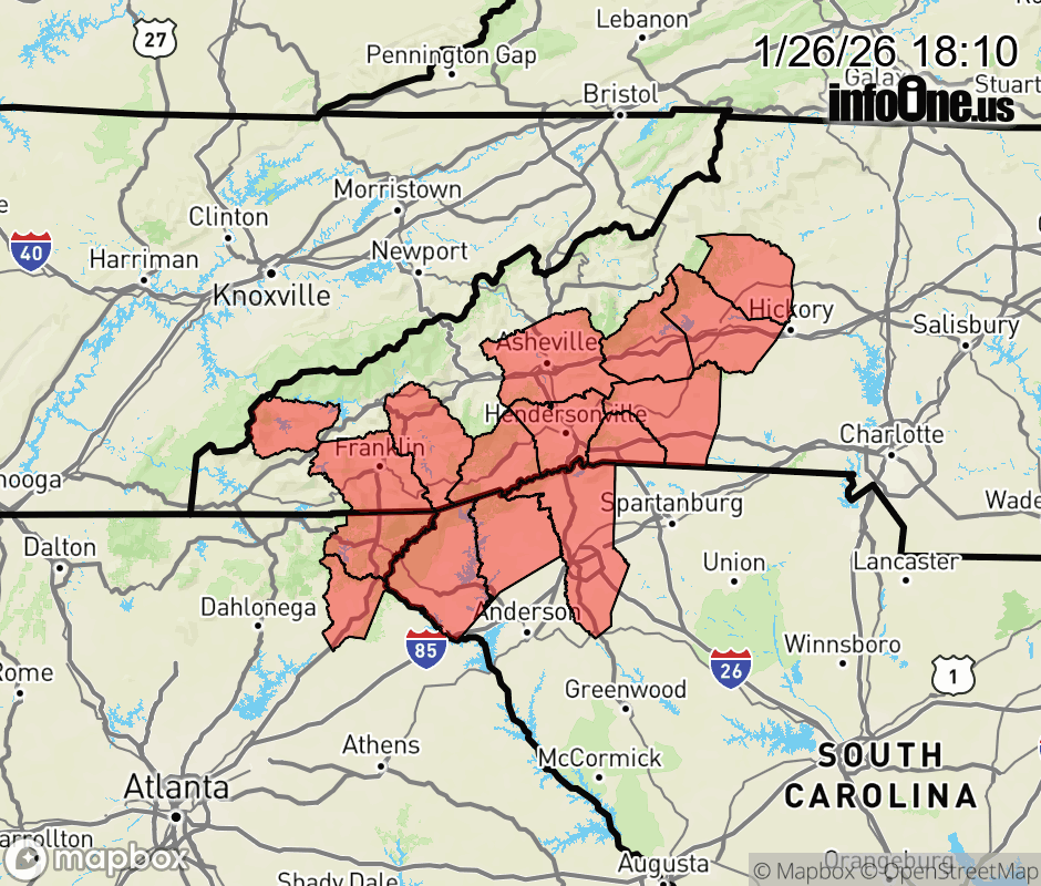 Canceled 1/27/26 1:05 AM Cold Weather Advisory issued January 26 at 6:09PM EST until January 27 at 12:00PM EST by NWS Greenville-Spartanburg SC * WHAT... Very cold wind chills as low as 13 below zero are expected. * WHERE... In Georgia, Rabun County. In North Carolina, Buncombe, Graham, Henderson, Macon, Transylvania, and southern Jackson Counties. * WHEN... Until noon EST Tuesday. * IMPACTS... The dangerously cold wind chills as low as 13 below zero could cause frostbite on exposed skin in as little as 30 minutes. An extended period of freezing temperatures could cause ruptured water pipes. ![]() |