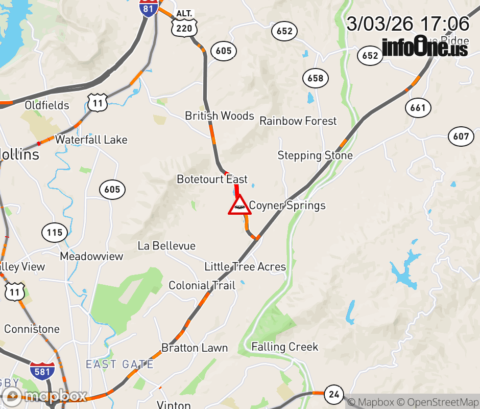 On ALT VA-220 North in the County of Botetourt, in the vicinity of Rt. 1464E/W (Botetourt County), motorists can expect delays due to a vehicle crash. Lane closures exist. Updated: Tue 3/3/26 5:06 PM EST ![]() Updated: Tue 3/3/26 5:06 PM EST |