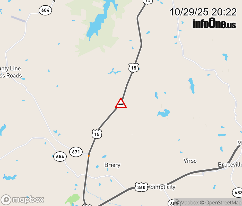 On US-15 North in the County of Prince Edward, in the vicinity of New Bethel Rd; Rt. 634E/W (Prince Edward County), motorists can expect delays due to a tractor trailer crash. Lane closures exist. ![]() |