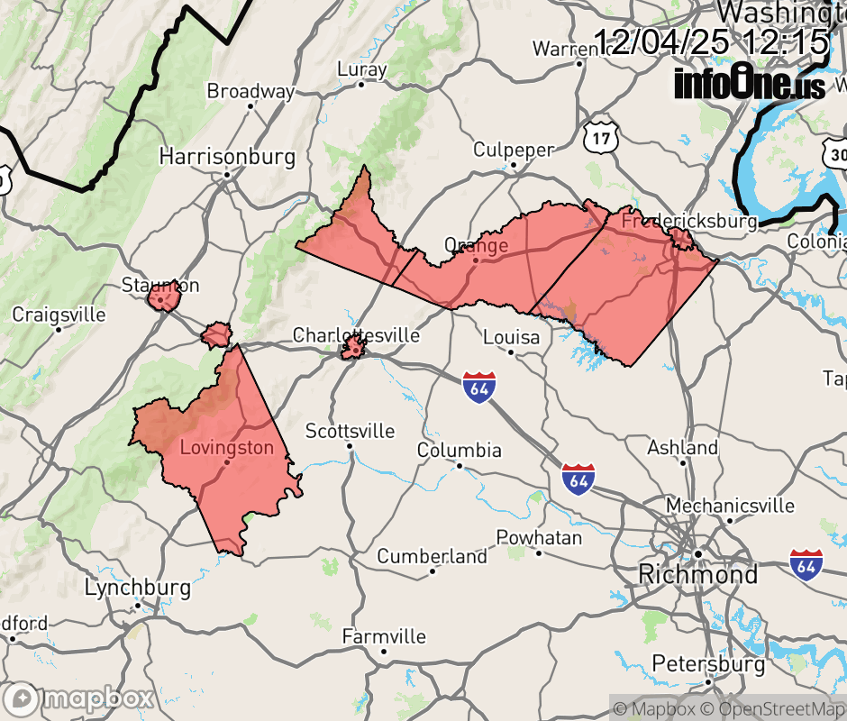 Canceled 12/4/25 1:58 PM Winter Weather Advisory issued December 4 at 12:13PM EST until December 5 at 4:00PM EST by NWS Baltimore MD/Washington DC * WHAT... Snow, with total accumulations of 1 to 3 inches. Localized totals around 4 inches are possible over the higher elevations of Augusta and Highland Counties. * WHERE... Portions of central and western Virginia. * WHEN... From 1 AM to 4 PM EST Friday. * IMPACTS... Plan on slippery road conditions. The hazardous conditions will impact the Friday morning commute. * ADDITIONAL DETAILS... Given temperatures will be in the 20s, snow is expected to accumulate on all untreated surfaces. A light snow will overspread the advisory area, with slightly higher amounts possible in any banding features. As snow winds down, a light freezing drizzle is possible into Friday evening. ![]() |