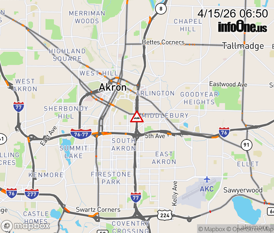 The right lane is blocked on SR-8 North at SR-18/Carroll St/Buchtel Ave, due to a disabled vehicle. Updated: Wed 4/15/26 6:50 AM EDT ![]() Updated: Wed 4/15/26 6:50 AM EDT |