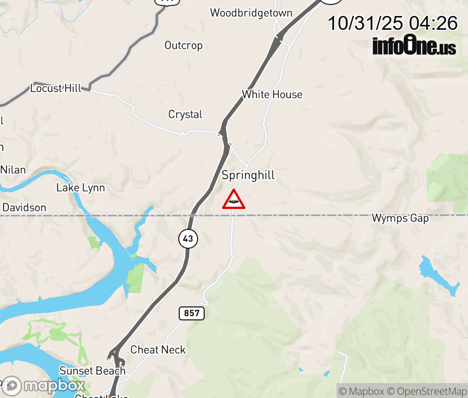 Vehicle Crash on WV-857 (1637 Fairchance Road). The northbound road is closed. The southbound road is closed. ![]() |