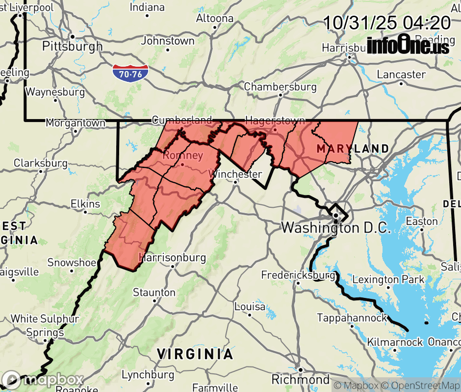 Canceled 10/31/25 5:00 PM Wind Advisory issued October 31 at 4:19AM EDT until October 31 at 5:00PM EDT by NWS Baltimore MD/Washington DC * WHAT... West winds 20 to 25 mph with gusts up to 50 mph expected. * WHERE... Portions of north central and western Maryland and eastern and panhandle West Virginia. * WHEN... From 10 AM this morning to 5 PM EDT this afternoon. * IMPACTS... Gusty winds will blow around unsecured objects. Tree limbs could be blown down and a few power outages may result. ![]() |