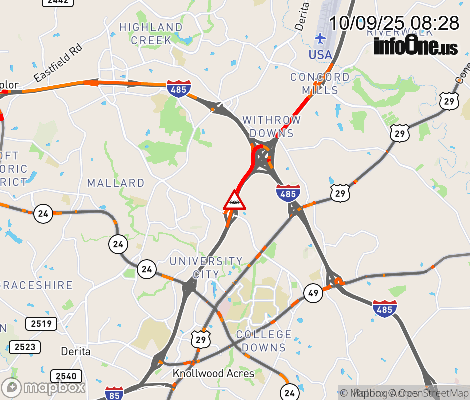 The two right lanes is closed at Exit 46 (Mallard Creek Church Rd.) Updated: Thu 10/9/25 8:28 AM EDT ![]() Updated: Thu 10/9/25 8:28 AM EDT |