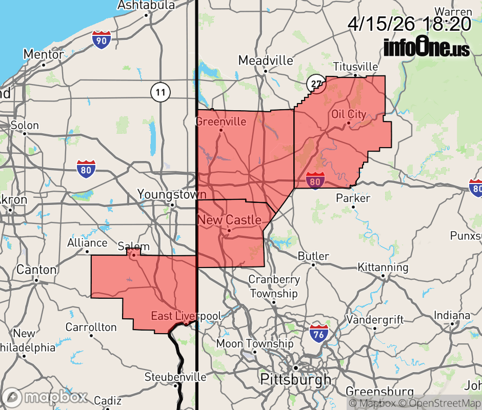 Canceled 4/15/26 8:28 PM Severe Thunderstorm Watch issued April 15 at 6:19PM EDT until April 15 at 9:00PM EDT by NWS Pittsburgh PA SEVERE THUNDERSTORM WATCH 120 REMAINS VALID UNTIL 9 PM EDT THIS EVENING FOR THE FOLLOWING AREAS IN OHIO THIS WATCH INCLUDES 1 COUNTY IN EAST CENTRAL OHIO COLUMBIANA IN PENNSYLVANIA THIS WATCH INCLUDES 3 COUNTIES IN NORTHWEST PENNSYLVANIA MERCER VENANGO IN WESTERN PENNSYLVANIA LAWRENCE THIS INCLUDES THE CITIES OF COLUMBIANA, EAST LIVERPOOL, ELLWOOD CITY, FRANKLIN, GROVE CITY, HERMITAGE, NEW CASTLE, OIL CITY, SALEM, AND SHARON. ![]() |
