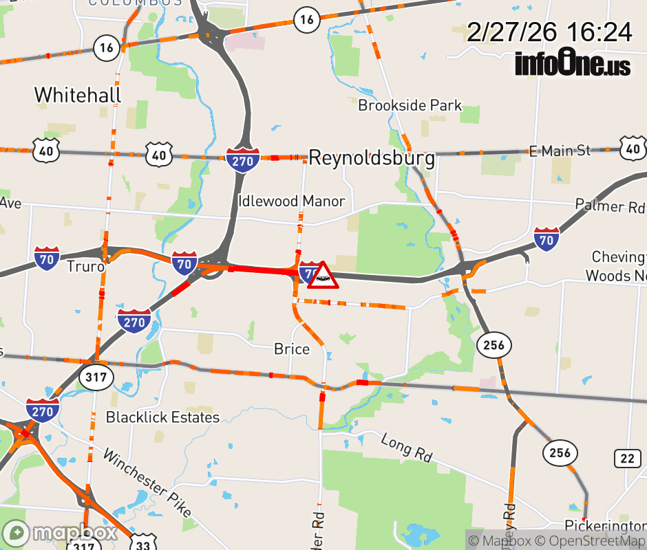 The right shoulder is blocked on I-70 East beyond Brice Rd North, due to a crash. Updated: Fri 2/27/26 4:24 PM EST ![]() Updated: Fri 2/27/26 4:24 PM EST |