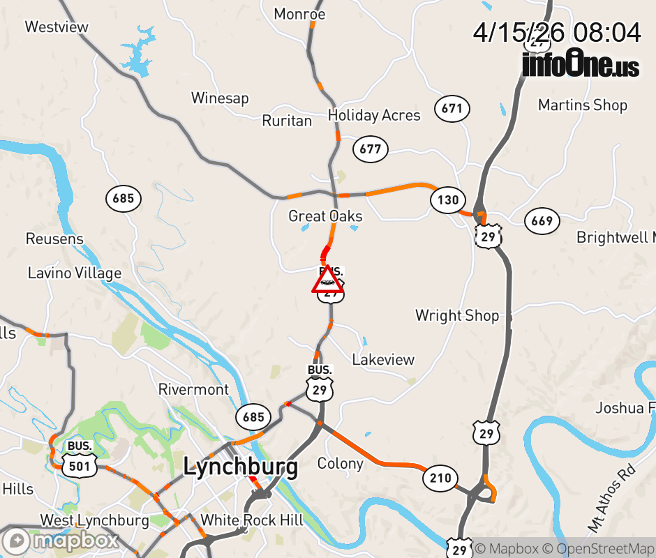 On BUS US-29 in the County of Amherst, in the vicinity of Daniels Dr; Dillard Rd; Seminole Plz; Thomas Rd; Woodvue Dr; Rt. 766N/S (Amherst County), motorists can expect delays due to a vehicle crash. The north left shoulder and left lane are closed. The south left shoulder is closed. Updated: Wed 4/15/26 8:04 AM EDT ![]() Updated: Wed 4/15/26 8:04 AM EDT |