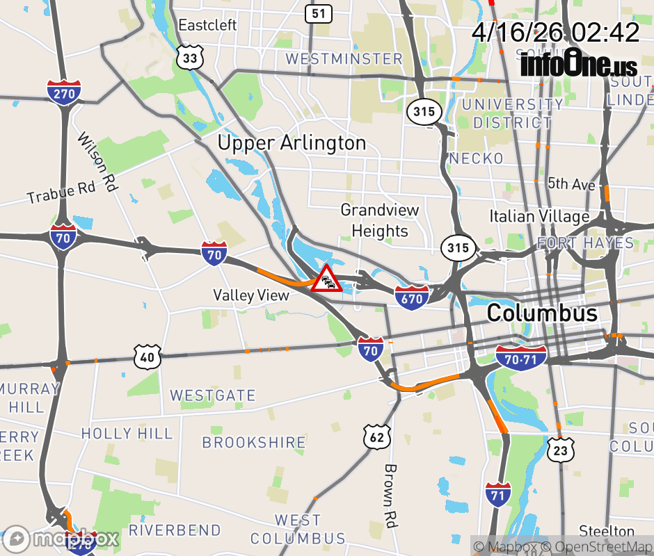 The 2 right lanes are blocked on I-670 West at US-33, due to repairs/maintenance. Updated: Thu 4/16/26 2:42 AM EDT ![]() Updated: Thu 4/16/26 2:42 AM EDT |