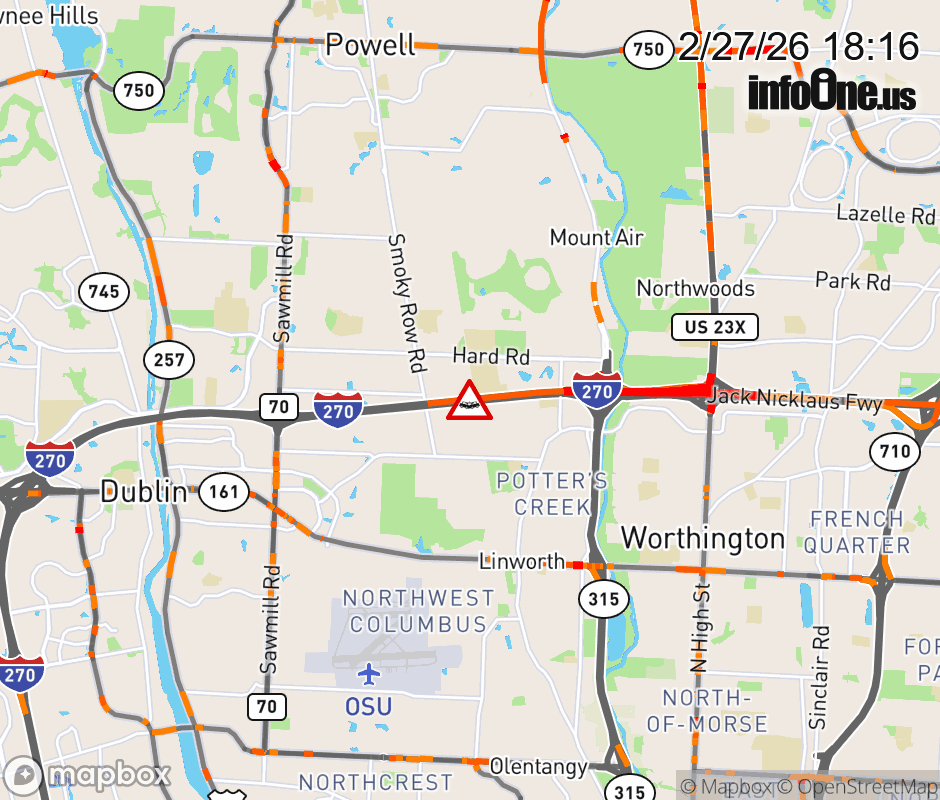 The left shoulder is blocked on I-270 West beyond SR-315 South, due to a crash. Updated: Fri 2/27/26 6:16 PM EST ![]() Updated: Fri 2/27/26 6:16 PM EST |