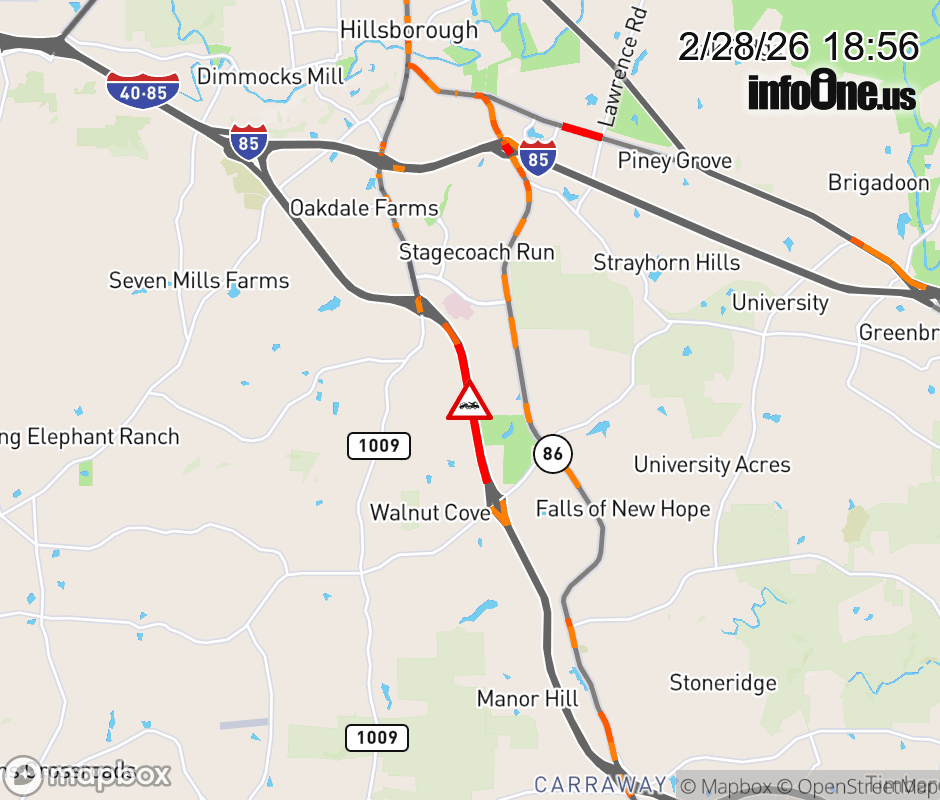The right lane is closed after Exit 261 (Old NC 86). Updated: Sat 2/28/26 6:56 PM EST ![]() Updated: Sat 2/28/26 6:56 PM EST |