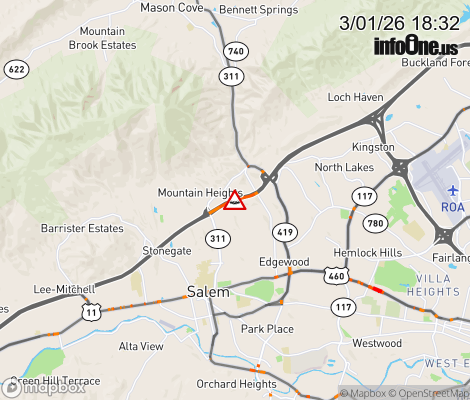 On I-81 at mile marker 140.8 in the County of Roanoke, motorists can expect delays due to a vehicle crash. The north left shoulder is closed. Updated: Sun 3/1/26 6:32 PM EST ![]() Updated: Sun 3/1/26 6:32 PM EST |