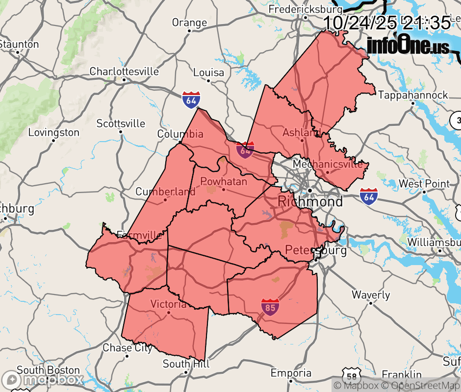 Canceled 10/25/25 6:41 AM Freeze Warning issued October 24 at 9:30PM EDT until October 25 at 9:00AM EDT by NWS Wakefield VA * WHAT... Sub-freezing temperatures as low as 31 expected. * WHERE... Portions of central, north central, and south central Virginia. * WHEN... From 2 AM to 9 AM EDT Saturday. * IMPACTS... Frost and freeze conditions could kill crops, other sensitive vegetation and possibly damage unprotected outdoor plumbing. * ADDITIONAL DETAILS... Note that Louisa and Fluvanna County already observed freezing temperatures early Friday morning, and therefore have ended their growing season and are not included in this Freeze Warning for Saturday morning. ![]() |