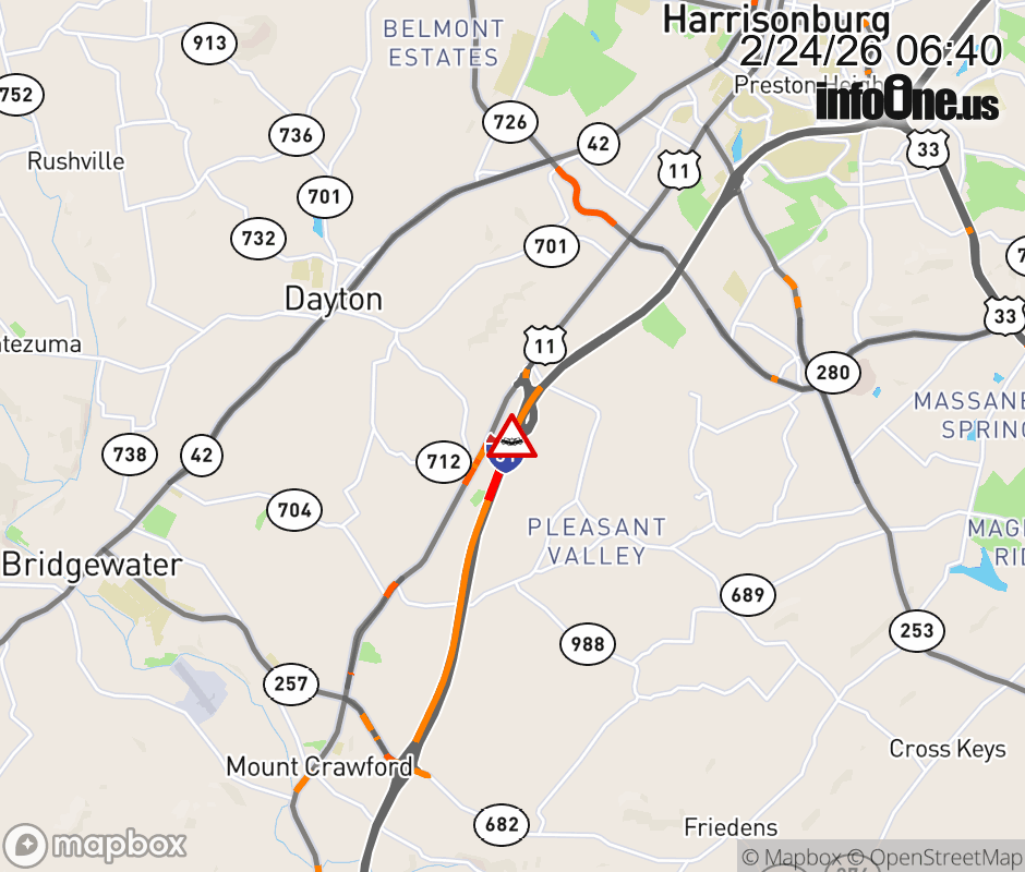 On I-81 at mile marker 243 in the County of Rockingham, motorists can expect delays due to a vehicle crash. The south left shoulder and left lane are closed. Traffic backups are approximately 0.5 mile. Updated: Tue 2/24/26 6:40 AM EST ![]() Updated: Tue 2/24/26 6:40 AM EST |