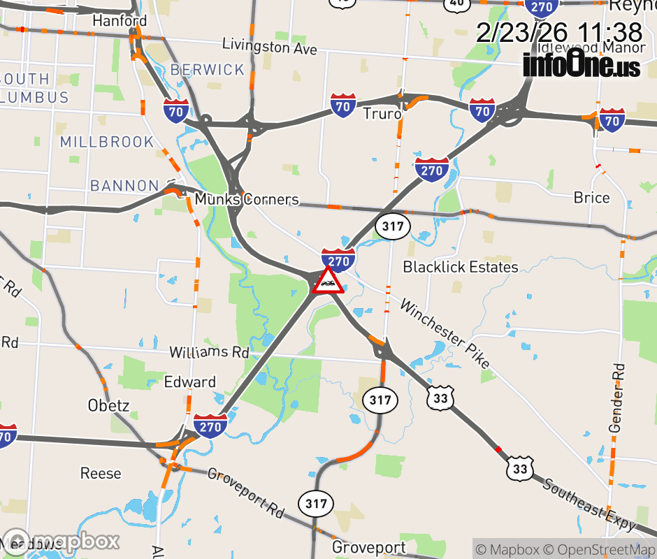 Ramp I-270 North to US-33 West CLOSED because of a disabled vehicle. Updated: Mon 2/23/26 11:38 AM EST ![]() Updated: Mon 2/23/26 11:38 AM EST |