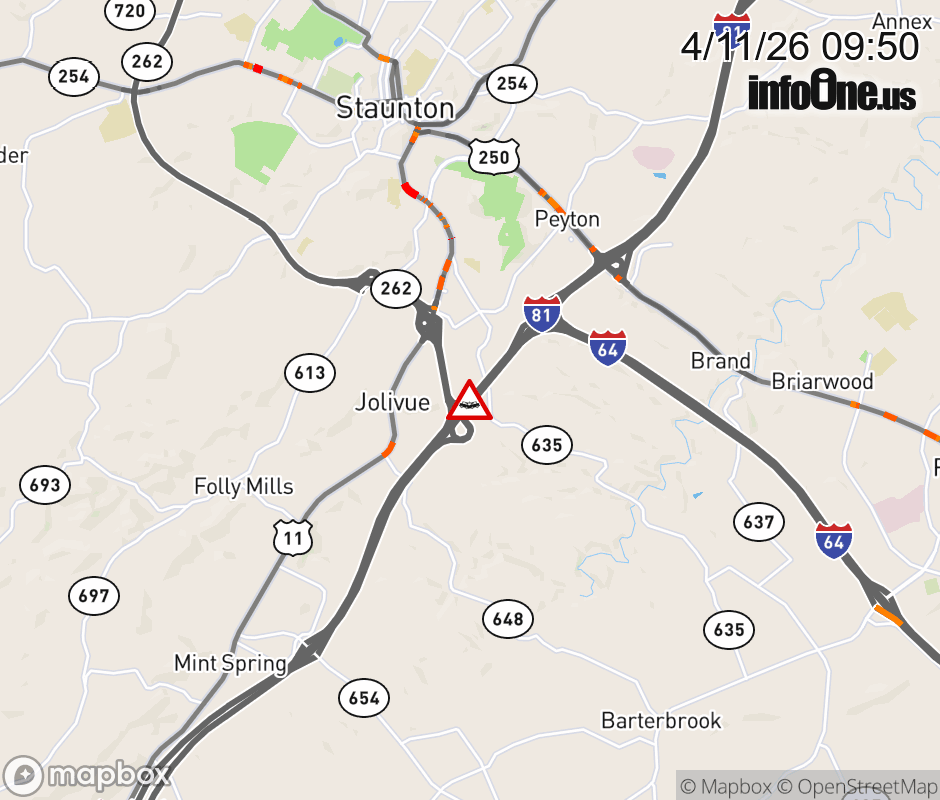 On I-81 at mile marker 220.8 in the County of Augusta, motorists can expect delays due to a vehicle crash. The south exit ramp narrows. Updated: Sat 4/11/26 9:50 AM EDT ![]() Updated: Sat 4/11/26 9:50 AM EDT |