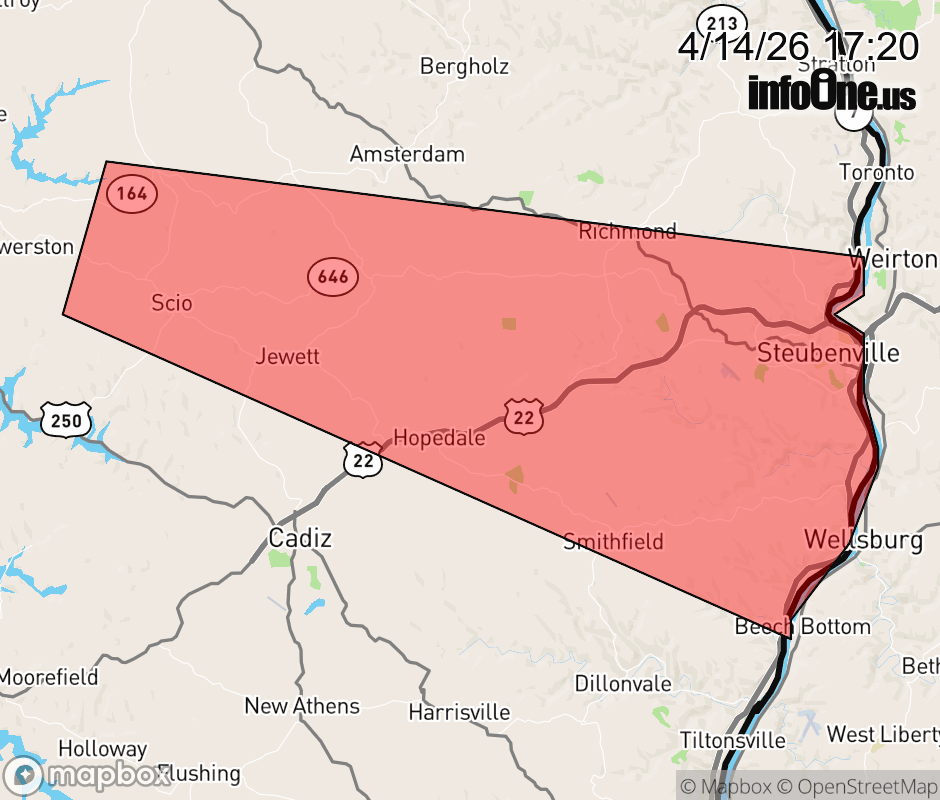 Canceled 4/14/26 5:29 PM Severe Thunderstorm Warning issued April 14 at 5:19PM EDT until April 14 at 6:00PM EDT by NWS Pittsburgh PA SVRPBZ The National Weather Service in Pittsburgh has issued a * Severe Thunderstorm Warning for... South Central Carroll County in east central Ohio... Northeastern Harrison County in east central Ohio... Central Jefferson OH County in east central Ohio... * Until 600 PM EDT. * At 519 PM EDT, a severe thunderstorm was located 10 miles north of Cadiz, moving east at 35 mph. HAZARD...60 mph wind gusts and quarter size hail. SOURCE...Radar indicated. IMPACT...Hail damage to vehicles is expected. Expect wind damage to roofs, siding, and trees. * Locations impacted include... Steubenville, Wellsburg, Wintersville, Mingo Junction, Hopedale, Smithfield, Scio, Jewett, Brilliant, Richmond, New Alexandria, Bloomingdale, Unionport and Brentwood. ![]() |