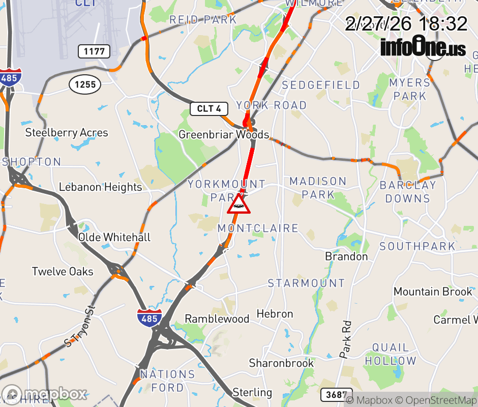 The right shoulder is closed at Exit 5 (Tyvola Rd.). Updated: Fri 2/27/26 6:32 PM EST ![]() Updated: Fri 2/27/26 6:32 PM EST |