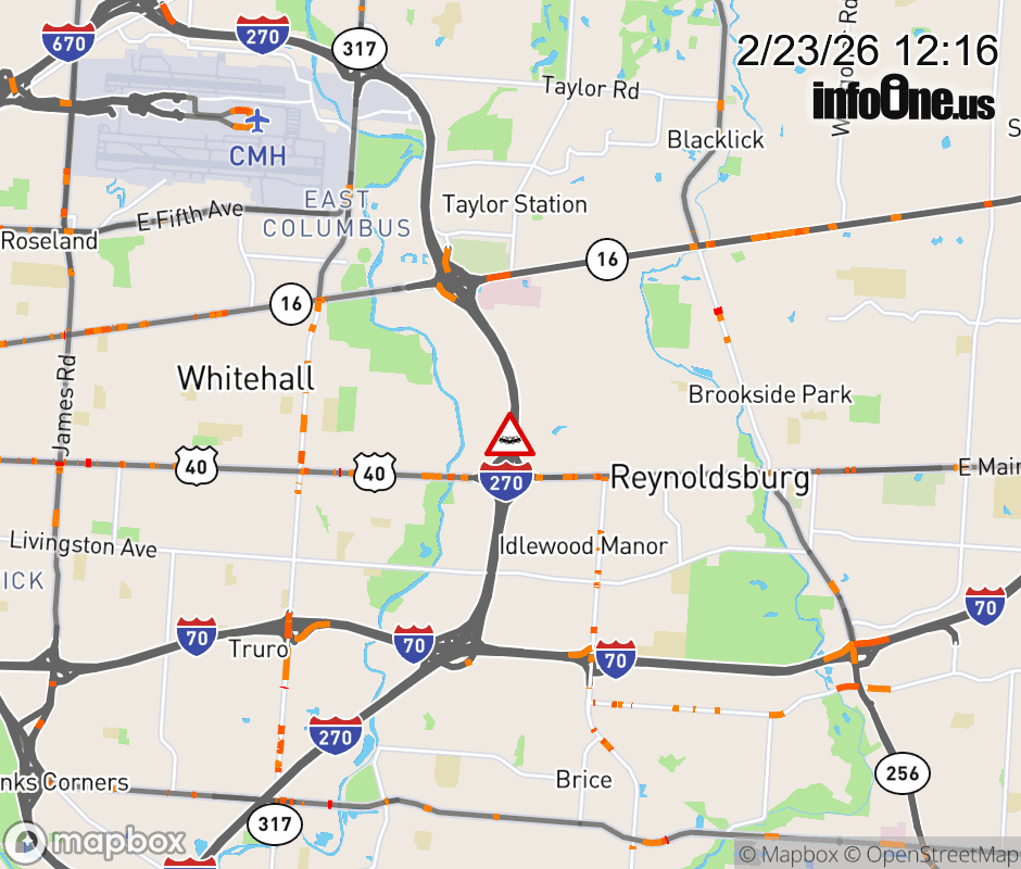 The right shoulder is blocked on I-270 South Collector at US-40/E Main St West, due to a crash. Updated: Mon 2/23/26 12:16 PM EST ![]() Updated: Mon 2/23/26 12:16 PM EST |