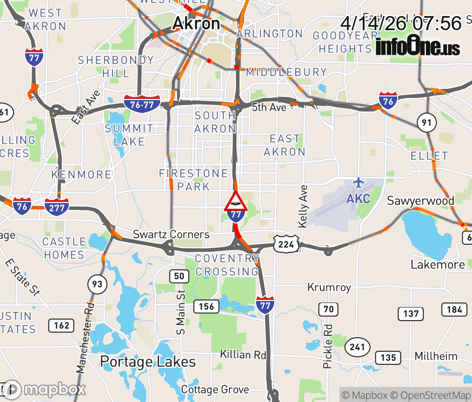 The 2 left lanes are blocked on I-77 North at SR-764/ Wilbeth Rd/Waterloo Rd, due to a crash. Updated: Tue 4/14/26 7:56 AM EDT ![]() Updated: Tue 4/14/26 7:56 AM EDT |