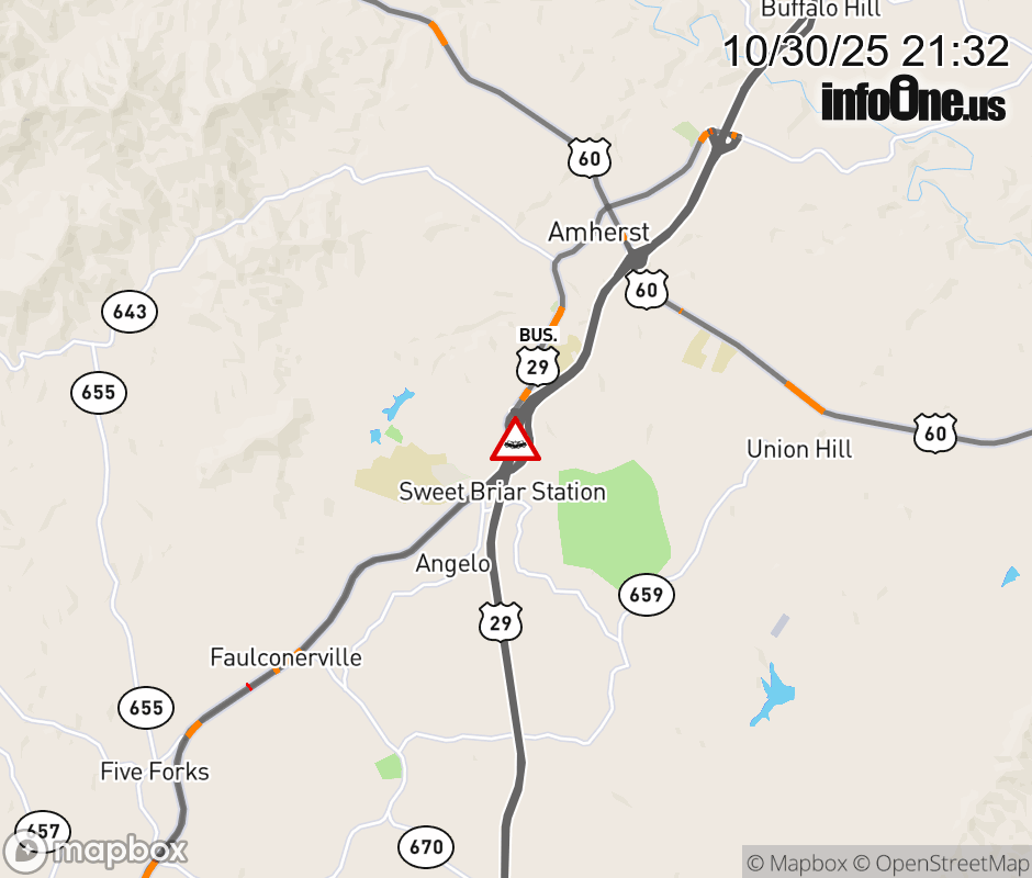 On US-29 North in the County of Amherst, in the vicinity of Ramp Intersection, motorists can expect delays due to a vehicle crash. Lane closures exist. ![]() |