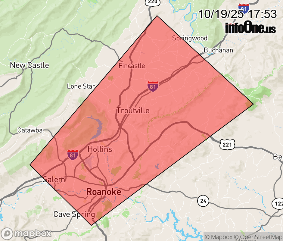 Canceled 10/19/25 6:15 PM Special Weather Statement issued October 19 at 5:51PM EDT by NWS Blacksburg VA At 551 PM EDT, Doppler radar was tracking a strong thunderstorm over Hollins, or over Roanoke, moving northeast at 40 mph. HAZARD...Wind gusts up to 50 mph. SOURCE...Radar indicated. IMPACT...Gusty winds could knock down tree limbs and blow around unsecured objects. Locations impacted include... Roanoke... Salem... Vinton... Buchanan... Troutville... Montvale... and Fincastle. ![]() |
