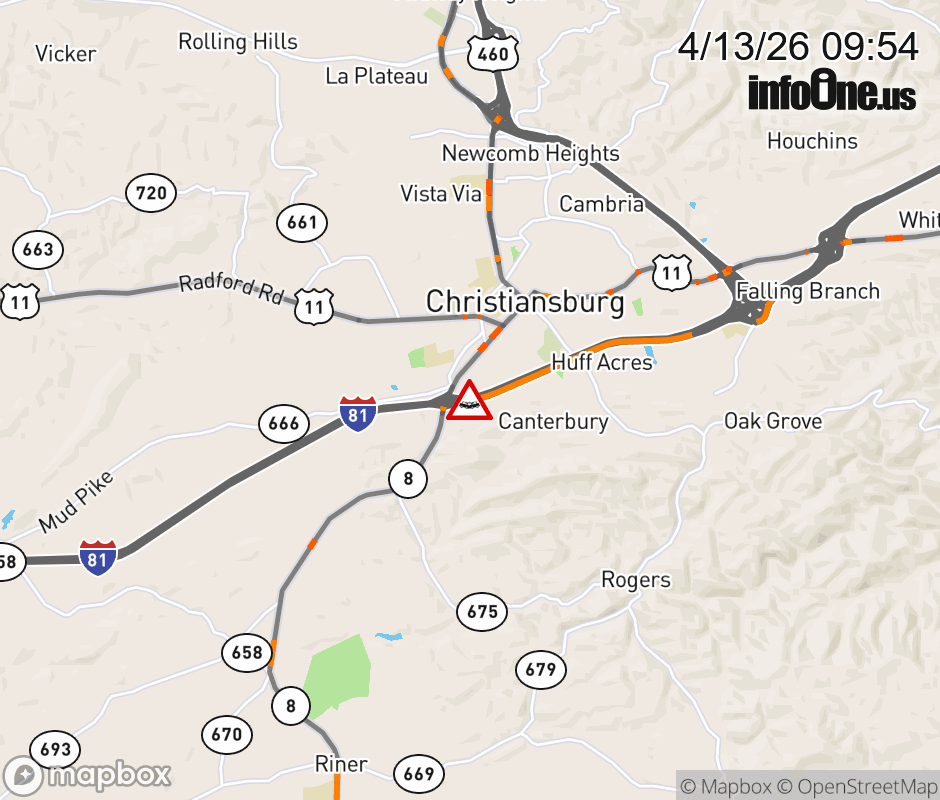 On I-81 at mile marker 114.6 in the County of Montgomery, motorists can expect delays due to a vehicle crash. The north entrance ramp narrows. ![]() |