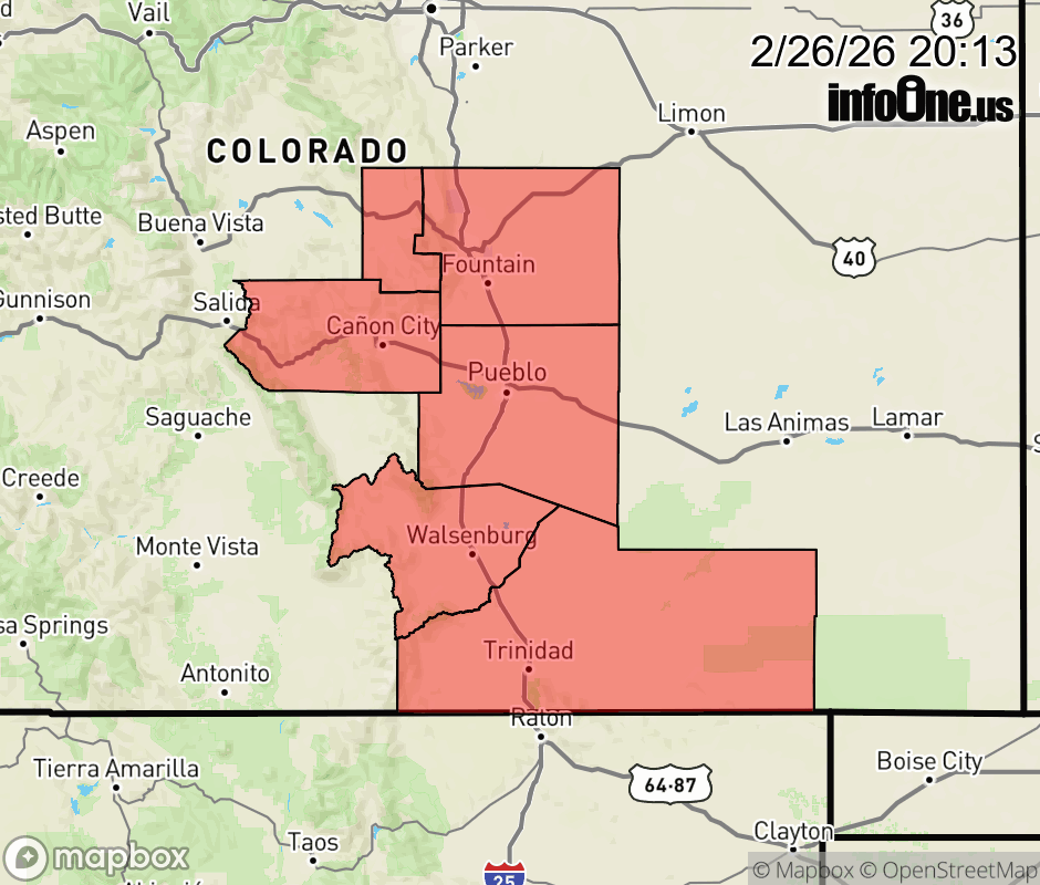 Canceled 2/27/26 3:40 AM Red Flag Warning issued February 26 at 6:12PM MST until February 27 at 6:00PM MST by NWS Pueblo CO * AFFECTED AREA... Fire Weather Zones 222, 227, 228, 229 and 230. * WINDS... West 10 to 20 mph with gusts up to 35 mph. * RELATIVE HUMIDITY... As low as 8 percent. * IMPACTS... Fires will catch and spread quickly. Exercise extreme caution with any outdoor burning. ![]() |