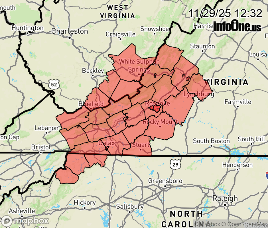 Canceled 11/29/25 7:12 PM Winter Weather Advisory issued November 29 at 12:30PM EST until November 30 at 12:00PM EST by NWS Blacksburg VA * WHAT... Freezing expected. Ice accumulations less than a tenth of an inch. * WHERE... Portions of northwest North Carolina, central, south central, southwest, and west central Virginia, and southeast West Virginia. * WHEN... From 2 AM to noon EST Sunday. * IMPACTS... Roads, and especially bridges and overpasses, will likely become slick and hazardous. Plan on slippery road conditions. ![]() |