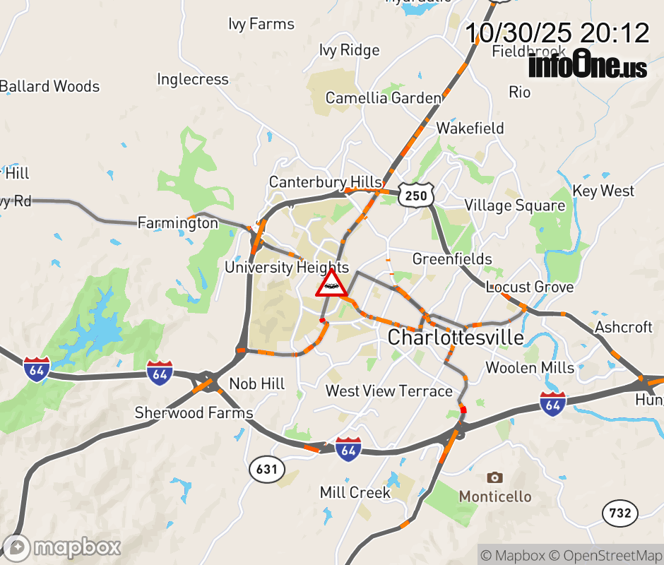 On BUS US-29 South in the City of Charlottesville, in the vicinity of Ivy Rd; BUS US-250E/W, motorists can expect delays due to a vehicle crash. Updated: Thu 10/30/25 8:12 PM EDT ![]() Updated: Thu 10/30/25 8:12 PM EDT |