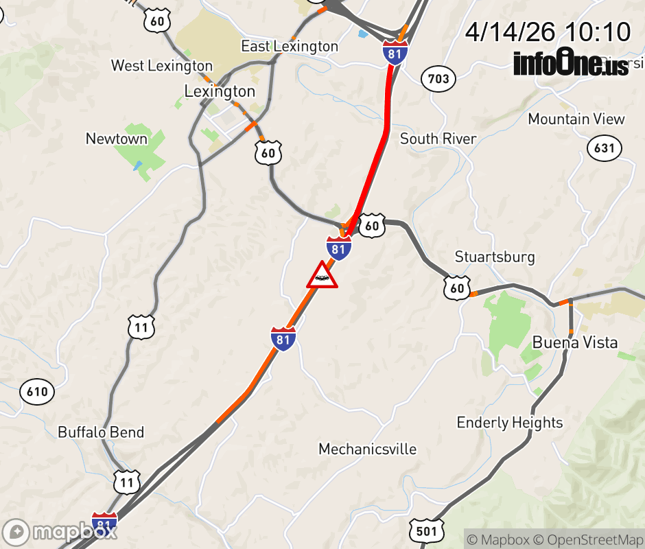 On I-81 South at mile marker 188 in the County of Rockbridge, motorists can expect delays due to a tractor trailer crash. Traffic backups are approximately 3.0 miles. Updated: Tue 4/14/26 10:10 AM EDT ![]() Updated: Tue 4/14/26 10:10 AM EDT |