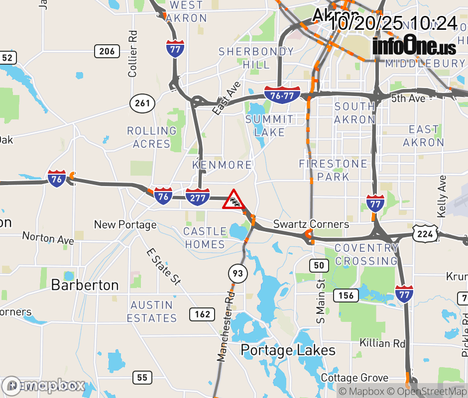 The 2 left lanes are blocked on I-277/US-224 West beyond SR-93/Manchester Rd/Waterloo Rd, due to debris on roadway. Updated: Mon 10/20/25 10:24 AM EDT ![]() Updated: Mon 10/20/25 10:24 AM EDT |