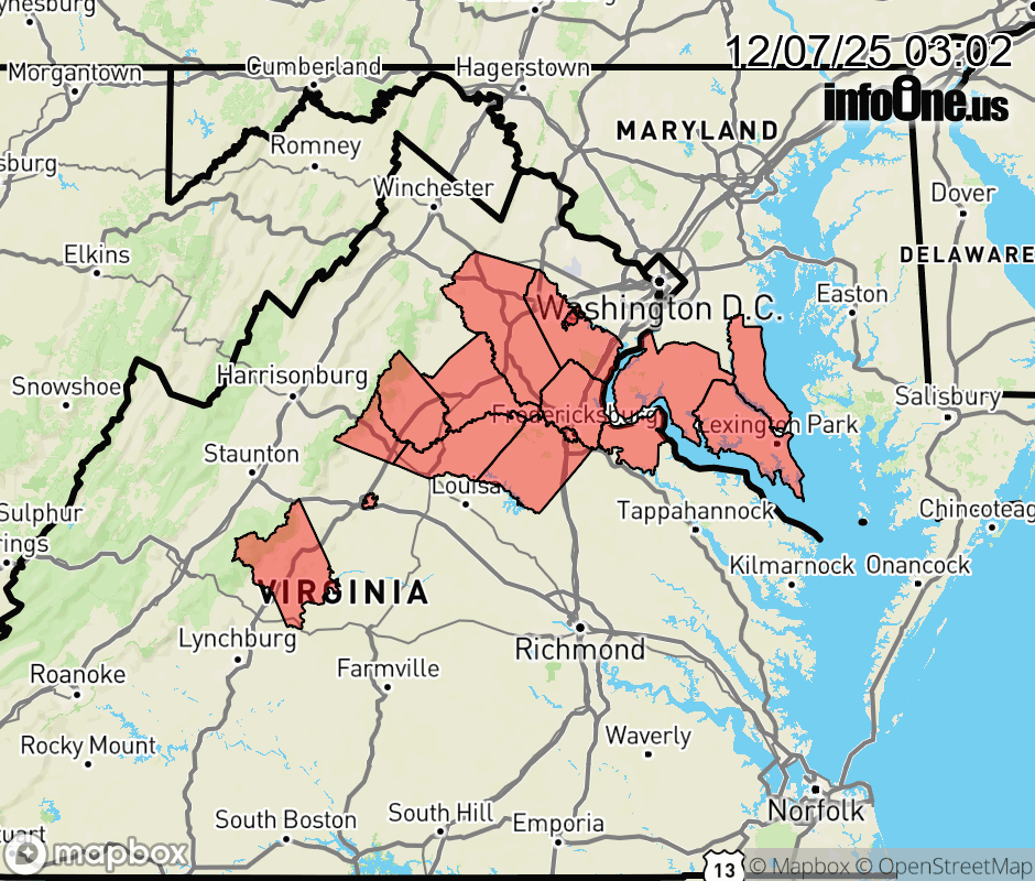 Canceled 12/7/25 8:27 AM Freezing Fog Advisory issued December 7 at 3:00AM EST until December 7 at 9:00AM EST by NWS Baltimore MD/Washington DC * WHAT... Visibility one quarter mile or less in freezing fog. * WHERE... Portions of southern Maryland and central, northern, and northwest Virginia. * WHEN... Until 9 AM EST this morning. * IMPACTS... Low visibility could make driving conditions hazardous. ![]() |