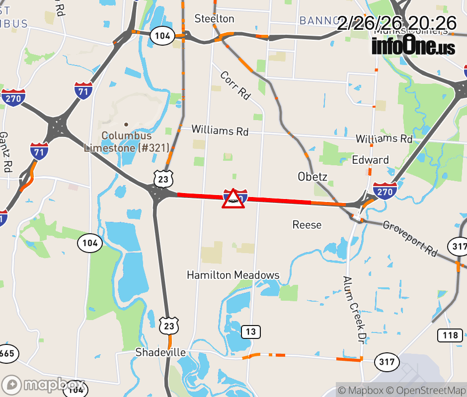 The left lane is closed on I-270 West beyond Alum Creek Dr, due to a crash. Updated: Thu 2/26/26 8:26 PM EST ![]() Updated: Thu 2/26/26 8:26 PM EST |