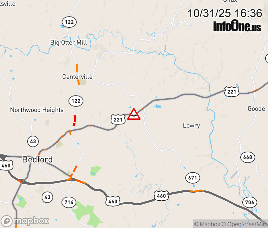 On US-221 North in the County of Bedford, in the vicinity of Centerville Rd; Timber Ridge Rd; Rt. 671E/W (Bedford County), motorists can expect delays due to a vehicle crash. Lane closures exist. ![]() |