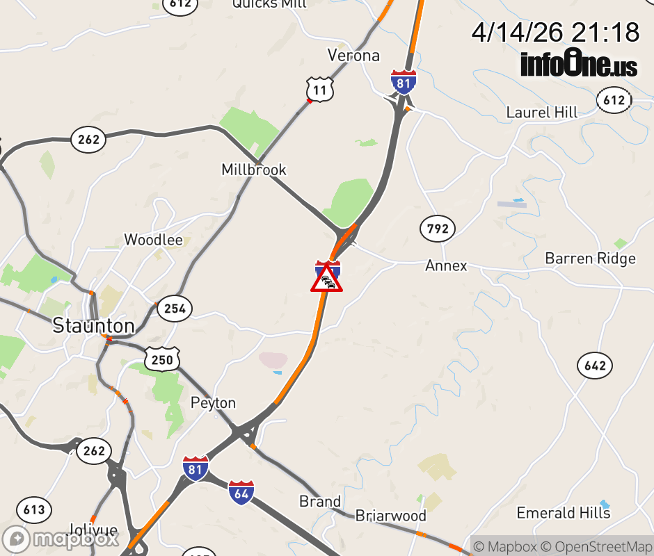 On I-81 South at mile marker 225 in the County of Augusta, motorists can expect delays due to congestion. Traffic backups are approximately 1.5 miles. Updated: Tue 4/14/26 9:18 PM EDT ![]() Updated: Tue 4/14/26 9:18 PM EDT |