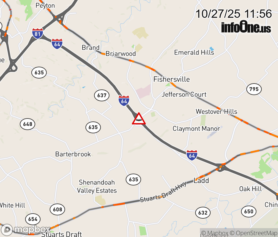 On VA-285 in the County of Augusta, in the vicinity of the ramp from and to I-64W, motorists can expect delays due to a vehicle crash. The north right lane and right shoulder are closed. ![]() |