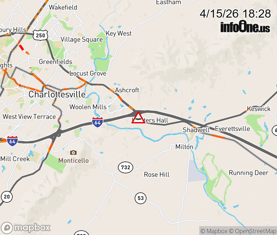 On US-250 in the County of Albemarle, in the vicinity of Crossover; South Lego Farm; Rt. 1107N/S (Albemarle County), motorists can expect delays due to a vehicle crash. The east right shoulder is closed. ![]() |