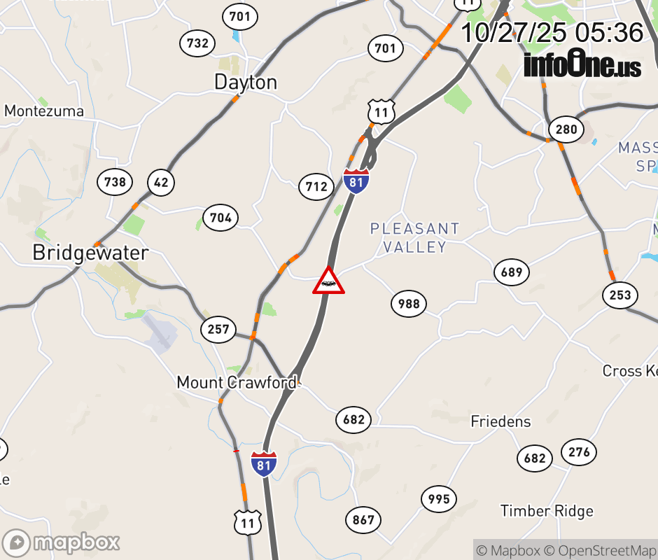 On I-81 at mile marker 241.5 in the County of Rockingham, motorists can expect delays due to a vehicle crash. The north right lane and right shoulder are closed. ![]() |