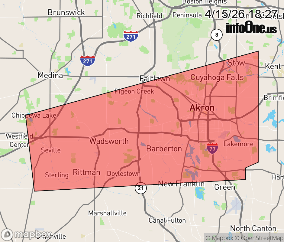 Canceled 4/15/26 6:43 PM Severe Thunderstorm Warning issued April 15 at 6:26PM EDT until April 15 at 7:00PM EDT by NWS Cleveland OH At 626 PM EDT, a severe thunderstorm was located near Rittman, or 8 miles south of Medina, moving east at 40 mph. HAZARD...Ping pong ball size hail and 60 mph wind gusts. SOURCE...Radar indicated. IMPACT...People and animals outdoors will be injured. Expect hail damage to roofs, siding, windows, and vehicles. Expect damage to trees and power lines. Locations impacted include... Akron, Cuyahoga Falls, Kent, Barberton, Green, Wadsworth, Tallmadge, Rittman, Mogadore, Doylestown, Creston, Chippewa Lake, Stow, New Franklin, Norton, Fairlawn, Munroe Falls, Lakemore, Silver Lake, and Seville. ![]() |